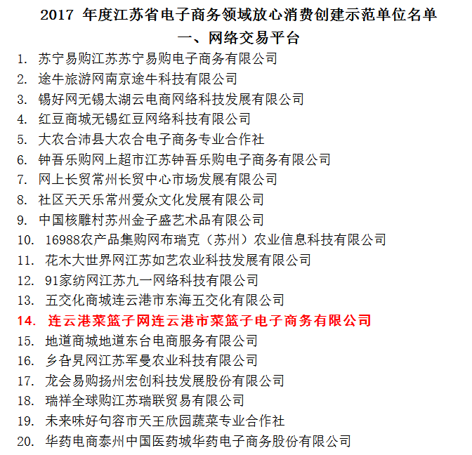 根據(jù)省工商局《關(guān)于開(kāi)展電子商務(wù)領(lǐng)域放心消費(fèi)創(chuàng)建活動(dòng)的通知》文件精神,公司以“連云港菜籃子網(wǎng)”為主體,積極爭(zhēng)創(chuàng),踴躍申報(bào),經(jīng)過(guò)層層初審、復(fù)審,連云港市菜籃子電子商務(wù)有限公司被江蘇省工商局、江蘇省商務(wù)廳、江蘇省經(jīng)信委、江蘇省放心消費(fèi)創(chuàng)建活動(dòng)辦公室、江蘇省社會(huì)信用體系建設(shè)領(lǐng)導(dǎo)小組辦公室授予“江蘇省電子商務(wù)放心消費(fèi)示范單位”榮譽(yù)稱號(hào) 。