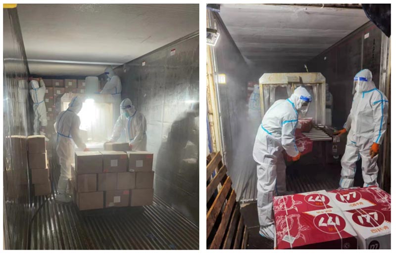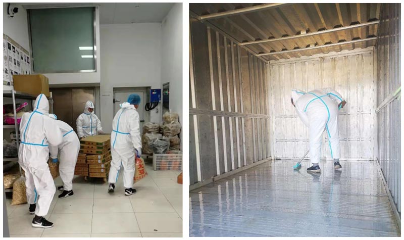 天緣物流集中監(jiān)管倉的同志們始終堅守在一線,日復一日的按照流程穿戴各種防護用品,忍受著汗水包裹在悶熱難耐的防護服里,嚴格遵照進口凍品出入集中倉標準,全方位的進行貨品消毒、裝卸堆碼、理貨清點、車輛消毒。監(jiān)管倉自開倉以來,大家都有一個簡單而堅定的信念:做好自己的防護工作,把貨物徹底消毒,安全入倉,直至最后出倉交付至貨主手中,全力保證監(jiān)管倉始終安全高效運行。